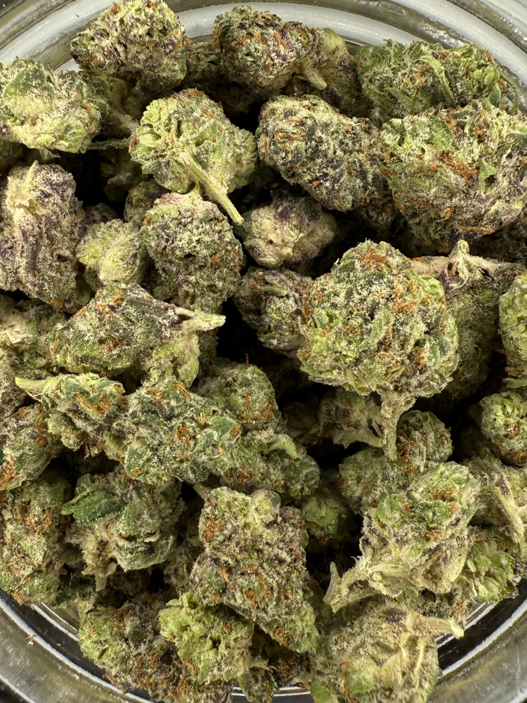 Aspetto: cime verdi dense, pistilli arancioni vivaci e uno strato scintillante di tricomi